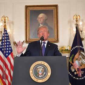 US President Donald Trump addresses the nation on the situation in Syria April 13, 2018 at the White House in Washington, DC. Trump said strikes on Syria are under way. / AFP PHOTO / Mandel NGAN (Photo credit should read MANDEL NGAN/AFP/Getty Images)